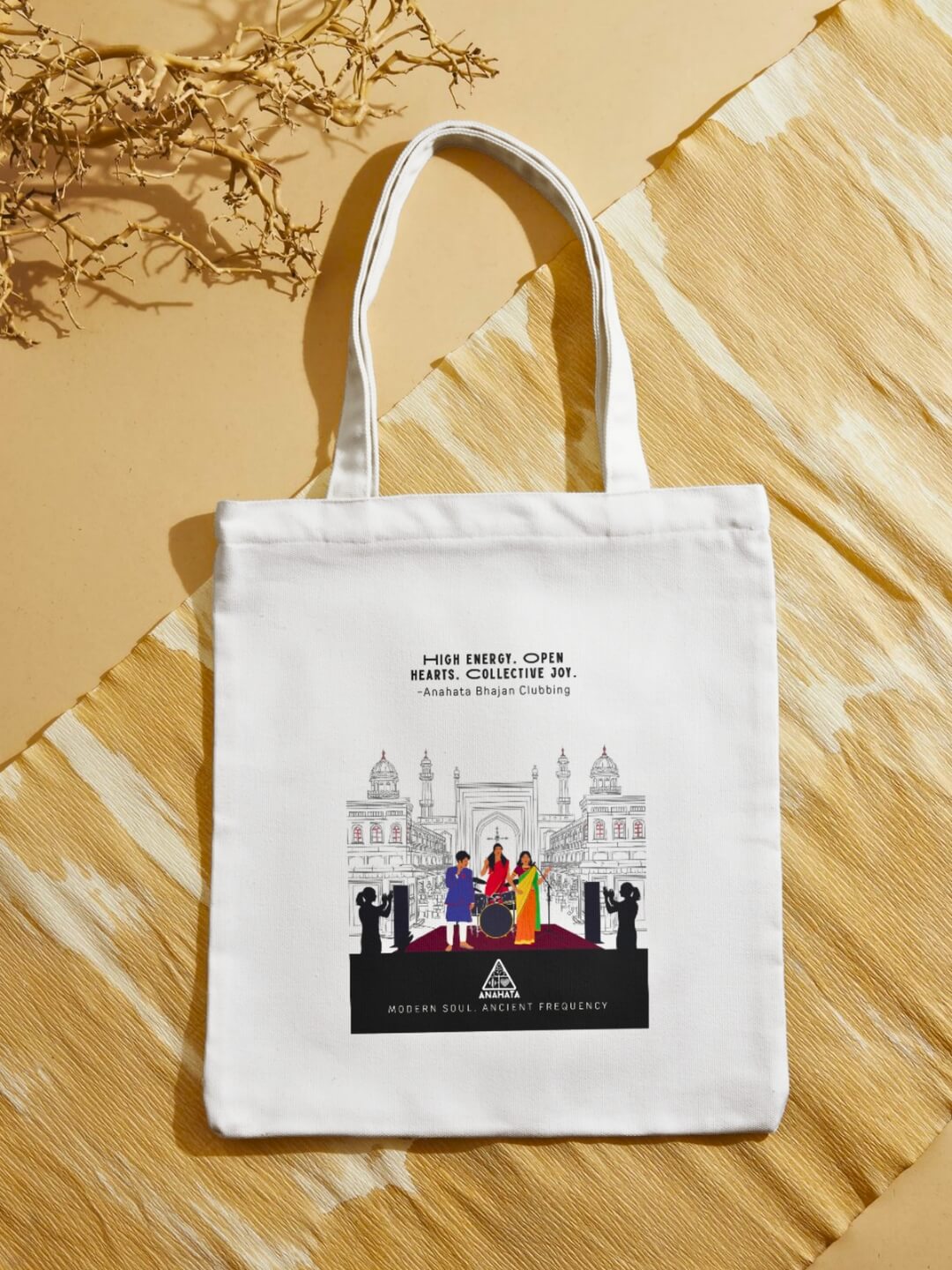 Inspired by Anahata Bhajan Clubbing, this architectural line art tote reflects devotional music experienced within collective spaces—temples, halls, courtyards where rhythm, chant, and community come together.
